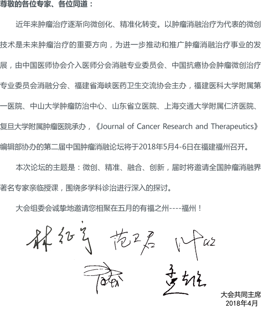 您好,由中国医师协会介入医师分会消融专业委员会、中国抗癌协会肿瘤微创治疗专业委员会消融分会、福建省海峡医药卫生交流协会主办的“2018第二届中国肿瘤消融论坛暨CT、MRI导向下介入培训班”,于2018年5月4-6日在福州举行。